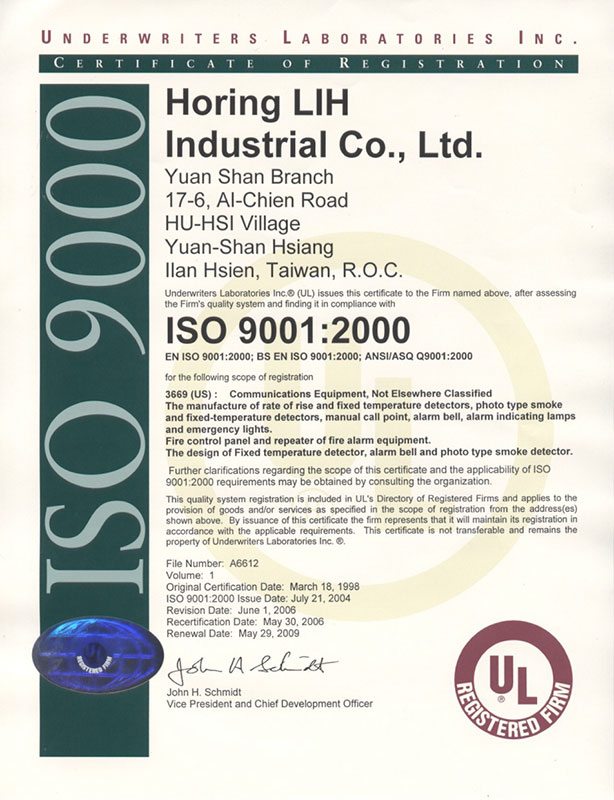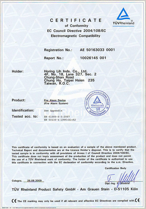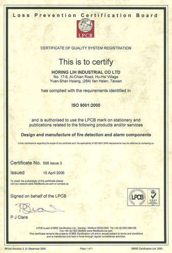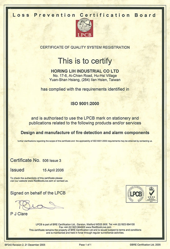 HORING LIH INDUSTRIAL Co., LTD is a professional Taiwanese manufacturer of fire alarm systems since 1984 and has many international certificates and awards in addition to the international quality certificates NFPA, LPCB, UL, ISO9001, EN -54, CNS, CE.
