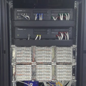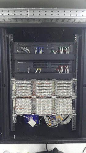A PBX Panasonic KX-NS500 VoIP, with a capacity of 12 CO lines + 10 DLI digital extension lines + 88 SLI single extension lines, with accessories including IP, digital, and single phones, as well as passive components such as outlet, cables, cabinets, and patch panels from Legrand.